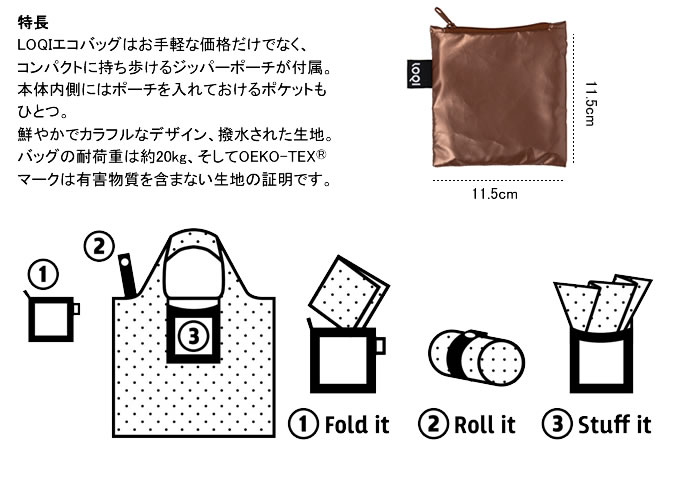 LOQI特有の小さく折り畳め付属のジッパーポーチに収納可、スナップで丸めることもできます。