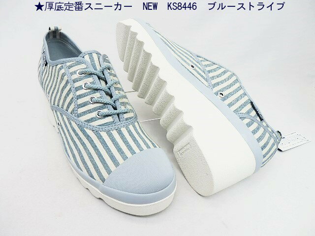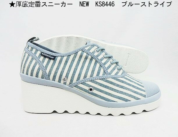 従来の履き心地と品質を大切にし、40年来愛された履き心地とファンタジーにあふれるデザインを継続 「在庫処分の限定特価 売り切れ次第終了 お早目に!」 ●商品名:KS8446 ブルーストライプ 人気の厚底スニーカーアレンジモデル 2Eサイズ 55ミリヒール ソールのつま先部分にも厚みがあるので、前後の高低差が気にならず、長く履いても疲れにくいデザイン。